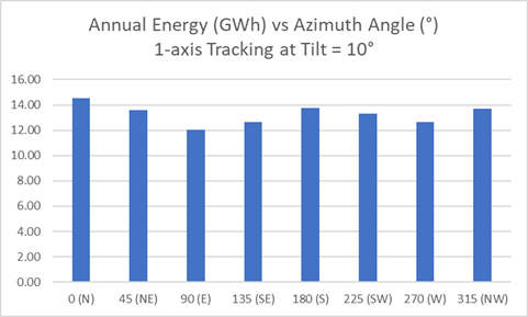 As for the optimal azimuth angle, for a tilt angle of 10 degrees, and a range of azimuth angles from zero to 315 degrees, the maximum annual output is for an azimuth angle of zero: