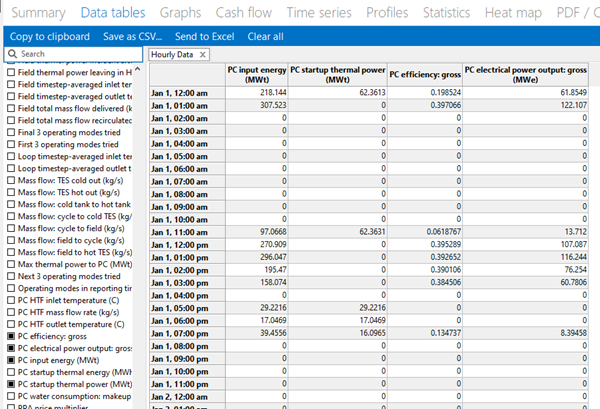 This screenshot shows the Data Tables tab on the Results page with variables that show that for hours except startup hours,
