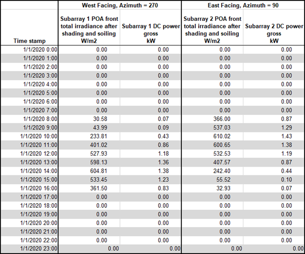 Attached is a .sam files for a 5 kW PV system configured with two subarrays. Both have a tilt angle of 20 degrees with Subarray 1 facing West and Subarray 2 facing East. The table below shows results for a system with a fixed array (no tracking) for January 1: