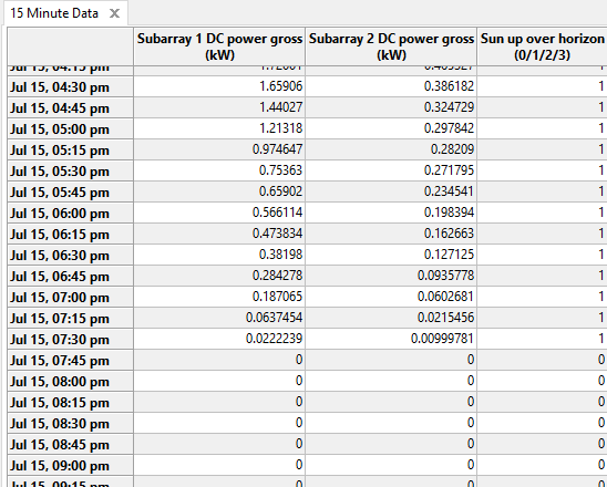 Here are results from a simulation using 5-minute time steps for a 5 kW system Phoenix, Arizona that show the array output tapering off more than the results from the 60-minute time steps. The output for both subarrays stops at the same time when the sun angle indicates the sun is below the horizon, but the output of the east facing subarray is much less than that of the west-facing array.