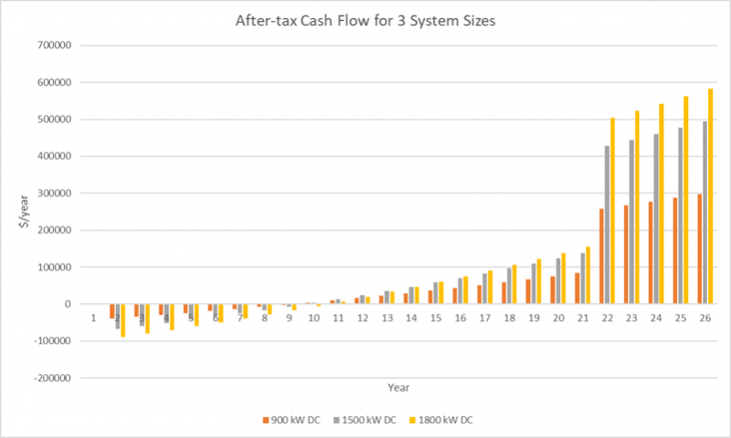 The following graph shows the annual-after tax cash flow for three system sizes from your .sam file. The net present value is calculated from the after-tax cash flow, so the graph gives a visual representation of the NPV. The 900 kW system has lower costs than the larger systems in the first 10 years, but then has lower savings in the later years. The 1800 kW system has higher savings in the later years, but higher costs in the earlier years. The balance of these costs and savings for the 1500 kW system results in the lowest NPV given the inflation and discount rates you assumed for your analysis.