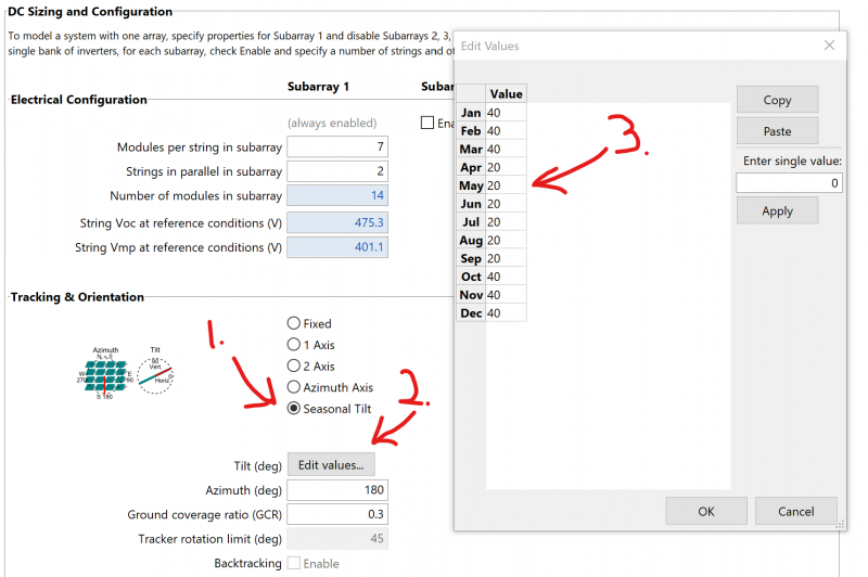 The seasonal tilt option for tracking (Detailed Photovoltaiic model) allows you to set the array tilt angle for each month of the year. The tilt angle is in degrees from horizontal, so a tilt angle of zero would be for a horizontal array, and a tilt angle of 90 degrees would be for a vertical array.