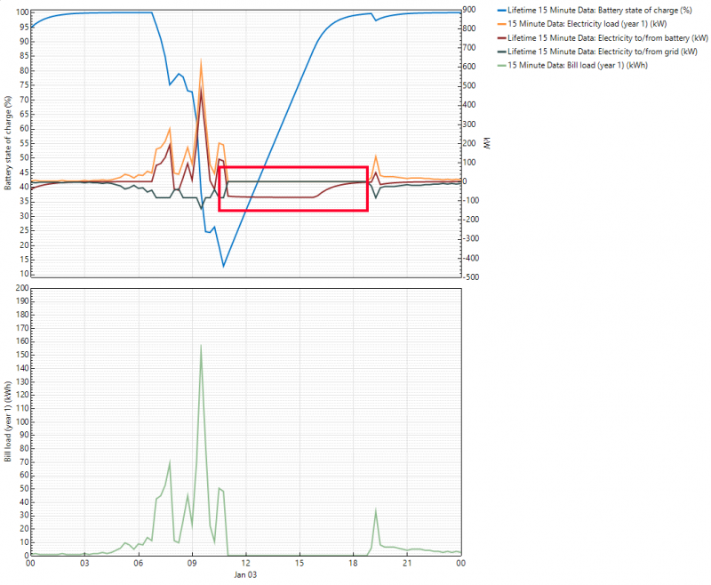 As you can see in the plot below, the battery correctly shaves the grid power and discharges to 12%. After the even, the battery is recharged (red square) back to 100%. Although the battery power seems correct, the grid power stays null during the whole phase. It is the same for the "Bill load".
