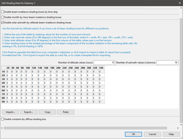 The "Import shading data from external tools" buttons read data from a file created by PVsyst, SunEye, or SolarPathfinder software and enable the appropriate input table and populate the table with data from the file.
