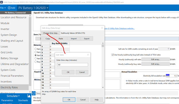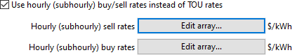 When you check Use hourly (subhourly) buy/sell rates instead of TOU rates, SAM uses the time series buy and sell rates that you enter in the tables (by clicking Edit array) instead of the buy and sell rates shown in the table under "Energy Charges."