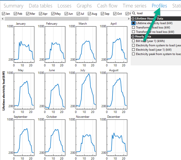 I think the "profile" tab show the average of, for example, every month's day electricity load kW or kWh in each hour, but to find the total kWh in one specific day we can use the "daily" tab in the load profile data and multiply the kW by 24 hours. See picture attached.