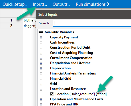 4. Click a cell row in the "solar_resource" column of the parametrics table, and choose the weather file from the solar resource library. This list of weather files is the same as the list you see on the Solar Resource page.