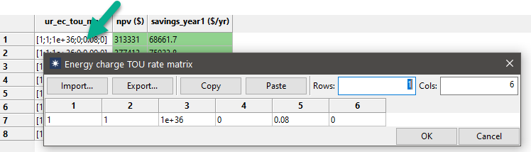 Click the cell in the parametric table under "ur_ec_tou_mat" to edit the energy charge inputs for each row in the parametric table: