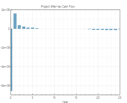 First of all, the NPV values are negative and then the cash flow around year 17 starts to be negative. It seems like as the time increases, this CSP parabolic trough plant is making the owner losing money. Is this because of the location irradiation resources? I found a paper also having negative cash flow but it happened at beginning and then after that the cash flow becomes positive.