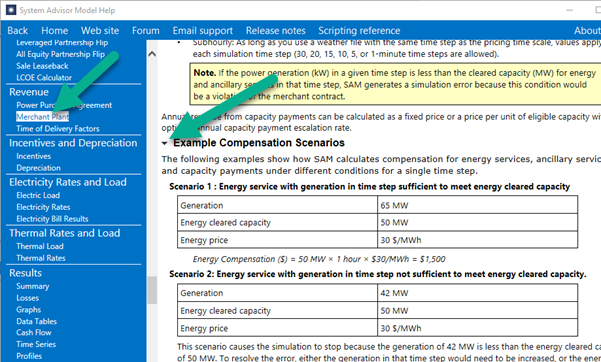 There is a section in the Help topic for the Merchant Plant model Revenue page that shows example compensation scenarios that might help explain how the cleared capacity works. You need to expand that section to see the scenarios and explanations: