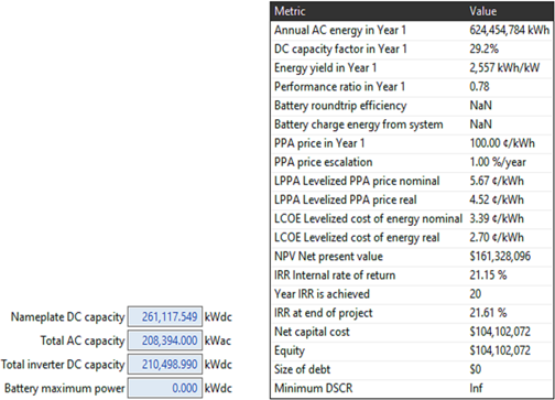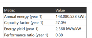 But in the model I’m working on, I get an Annual Energy (year 1) of 143,080,528 kWh and the DC nameplate capacity of the systems is 62,496 kW. So the Energy Yield should be 2,289 kWh/kW. Instead, in the Summary page it displays 2,368 kWh/kW.