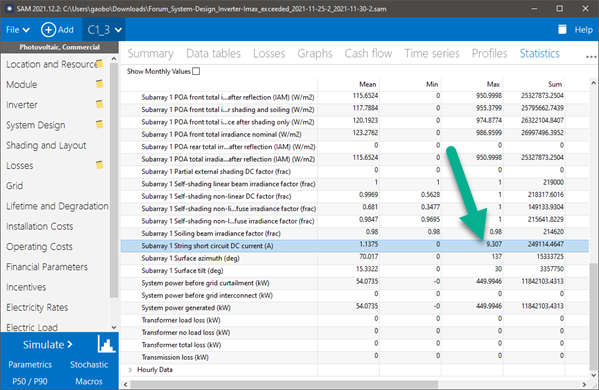 In my System Design with 120 strings in parallel, this would result in 120 * 10.8 A = 1296 A. This is significantly more than the 20x inverter's max. DC input current of 49.5 Adc per inverter, meaning 20 * 49.5 Adc = 990 Adc < 1296 A. Wouldn't be a warning by SAM useful?