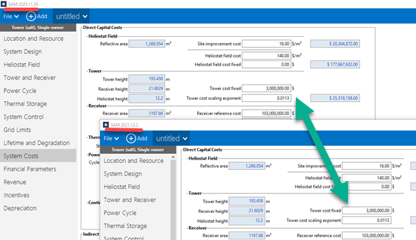 First, I think that between SAM v2020.11.29 and v2021.12.2 the default value for "tower cost fixed" changed from $8M to $3M, at least based on looking at my prior saved model files. I couldn't find a section in the release notes covering this, so I wanted to confirm whether this was the case (and, if so, inquire the reason: just incorporating more real-world data or something else?).