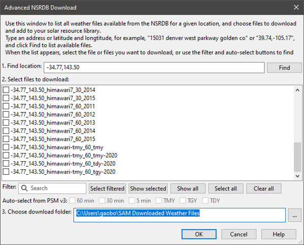 Check Advanced download on the Location and Resource page and then click Download and add to library to open the Advanced NSRDB Download window.