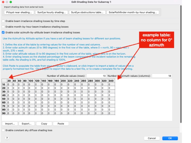 Hi Paul,thank you for your answer. I forgot to attach a screenshot that may explain my question.I assume that with the example table (see attachement) SAM will interpolate the values for azimuth = 0 between the values for 20° and 340°.I'm working on a solar module geometry that needs distinct shading values for plain north (azimuth = 0), so I need to add a "0°-column" (or maybe a 360°-column?). Will SAM accept a 0°-column let's say as second column in the table, right after the values for sun height? Or is it more difficult?Just wanted to make sure that I don't generate shading tables that don't work correctly.Greetings from MunichMirko