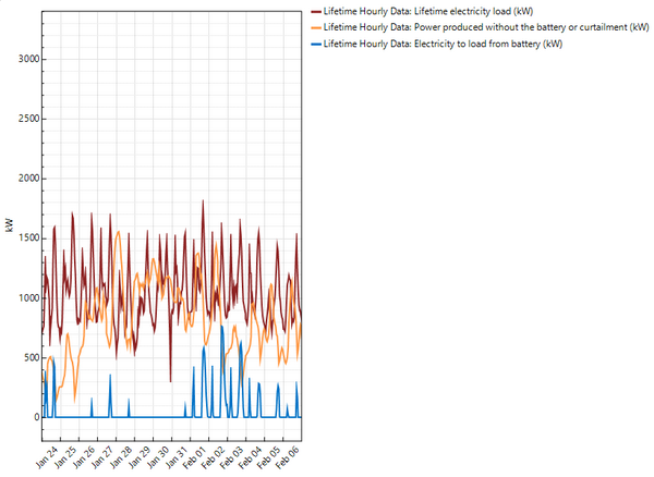 Strangely, there also appears to be a single spike (on Sept 30th) when the battery sends electricity to the grid for one hour. But at that same time period, the system is sending power to the grid (i.e. surplus power over load is being generated by the system) and there is a non zero load in that same time period (in fact no zero load conditions. I have a sneaking suspicion that the LCOE calcs are only picking up this power spike as the total KWH divisor.
