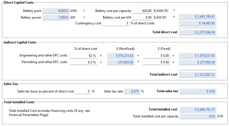 For the Standalone Battery model, the total installed cost per capacity shown on the Installation Costs page is defined as: