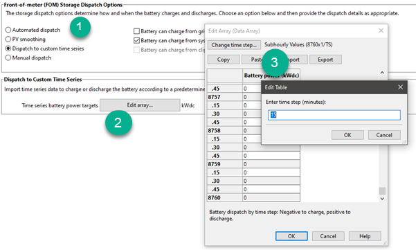 SAM does not automatically adjust the length of the custom time series dispatch array. If you choose a weather file with 15-minute time steps on the Location and Resource page, you have to set the time step for the battery dispatch to 15 minutes: