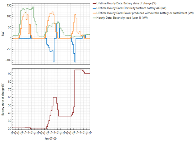 There are two case files, one with real PV simulation and another with power plant with manually set power output, in both cases the battery charging problem happens fairly early in the year, around the 8th or 9th of January.