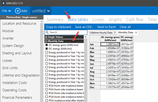 The Summary tab of the Results page for some performance models shows a graph of monthly output values. Otherwise, you can use the Graphs tab to create a graph. You can always export the data from SAM and use external software to create graphs.
