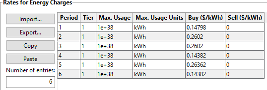 Next, set the sell rate for each time-of-use period in the energy charge rate table to the appropriate export rate: