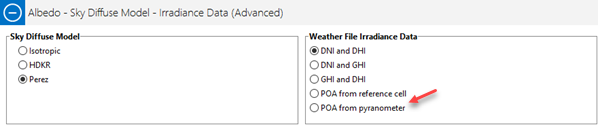 If your weather file includes POA data, to use it as input for the Detailed PV model, in a simulation, choose the appropriate "POA" option under Albedo - Sky Diffuse Model - Irradiance Data (Advanced) on the Location and Resource page.