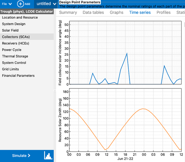Decreasing the minimum single loop flow rate (i.e., 2 kg/s) makes it easier for the HTF temperature to rise and allows it to stay above the startup temperature throughout the day. Therefore, the model calculates the incidence angle and shows expected behavior.