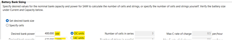 You can specify these units as AC kW and kWh or DC kW and kWh. SAM uses the Power Converters inputs on the Battery Cell and System page to calculate DC ratings if you provide AC units.
