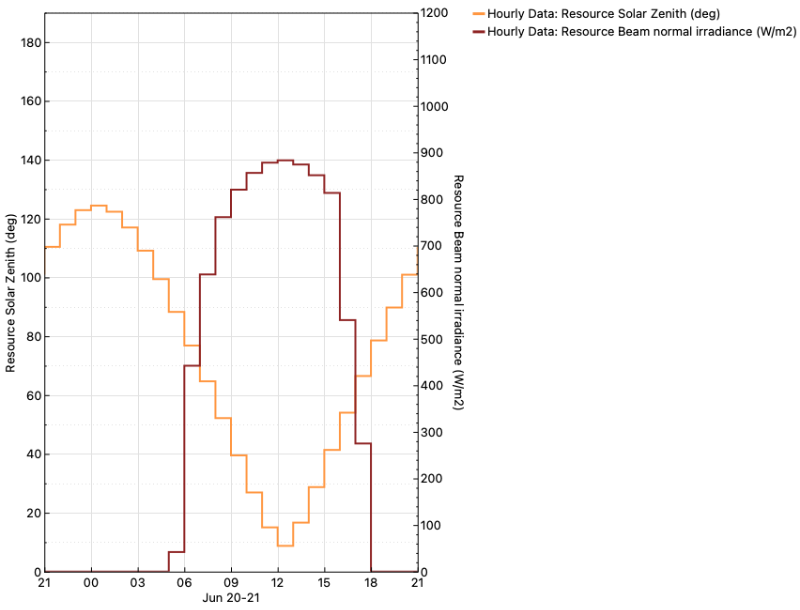 The coincidence of beam irradiance and sun zenith angle is easier to see in the graph if you change the model to "stepped lines" (click the wrench icon to change the mode). You can also use the data tables tab to compare the values.