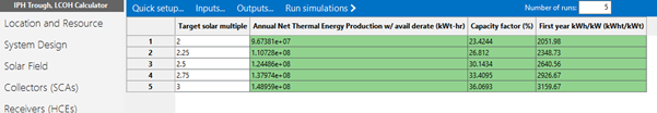 Then, on the Parametrics page, I tried a range of target solar multiple values between 2 and 3 with the following results:
