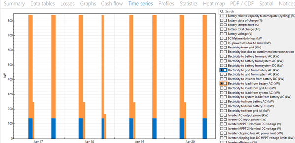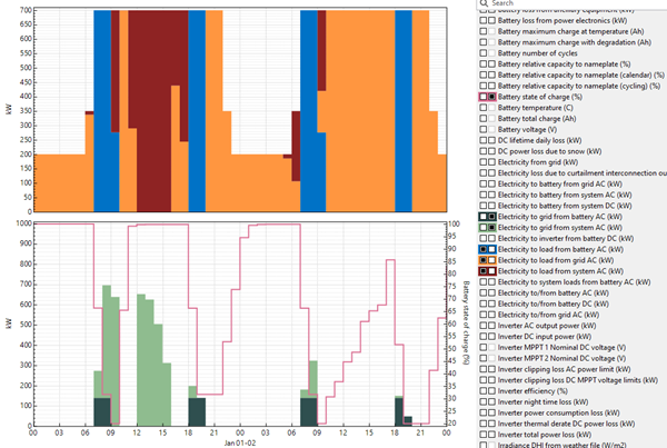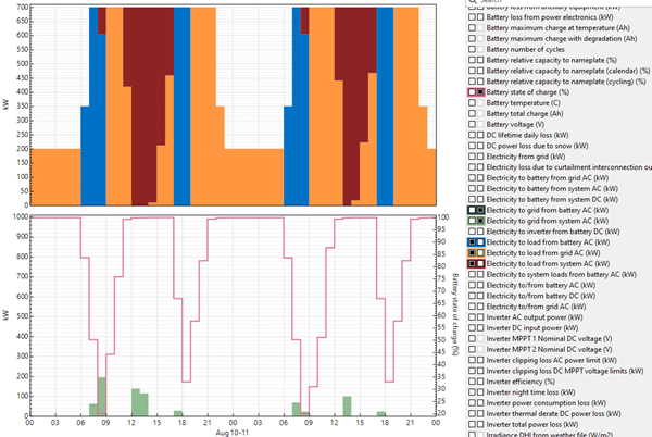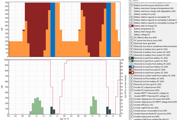 Thanks again from your response and I did notice then when I was looking through my model. What I don't understand is the discharge for the battery seems to drop from 840 kW to 700 kW from the 29th May to the 28th August (which is roughly the winter period). This is despite the SOC of the battery being 100% at the start of the discharge (peak tariff) period for all times of the year. Is there a reason for this? I can't see anything in my battery settings that would have caused this.