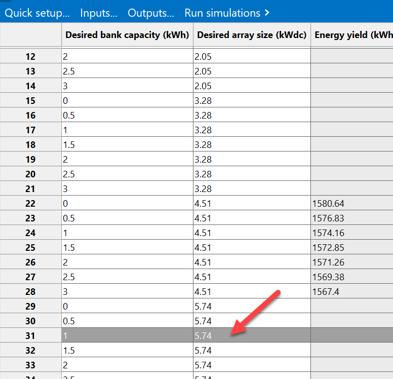 4. I recommend adding the "Battery average roundtrip efficiency" and "Performance ratio" or "Energy yield" to the parametric output variables so you can verify that the different size systems are performing reasonably well.