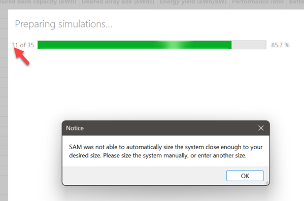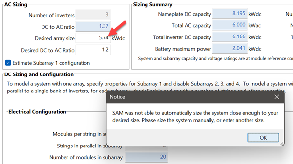 1. You have chosen "Desired array size (kWdc)" as a parametric input variable, but Estimate Subarray 1 configuration is not enabled on the System Design page.