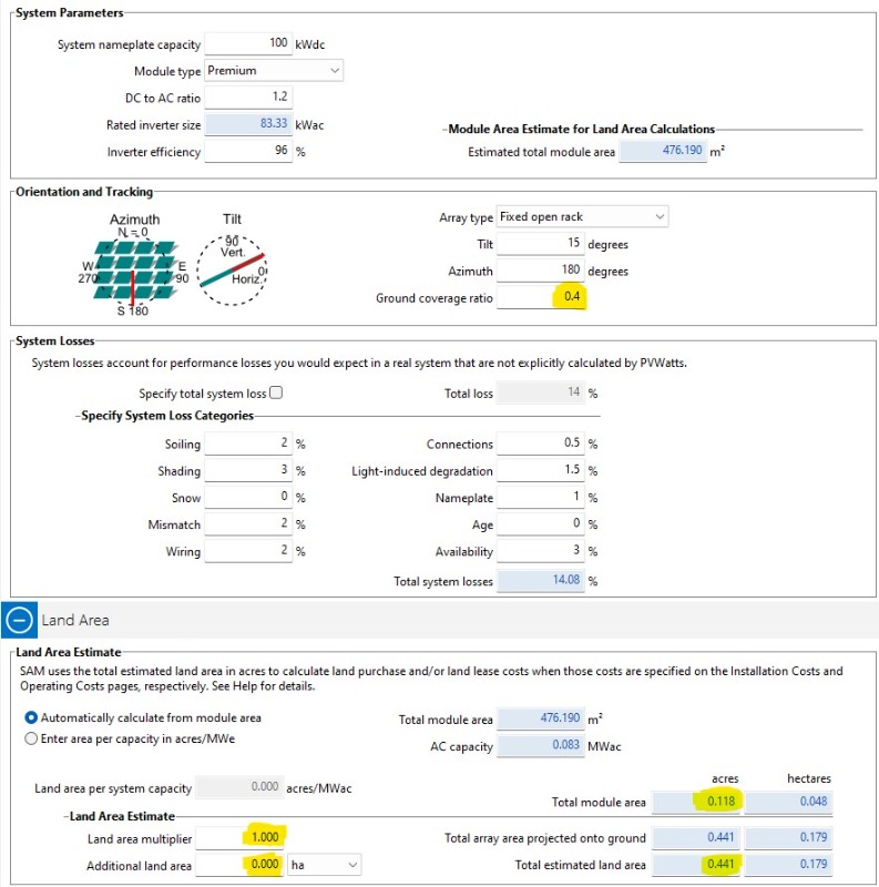 Thanks, Paul, for the quick reply. So, with this definition of ground coverage ratio that does away with the “projected onto ground”, the calculations make sense and I agree that then the GCR is independent of the tilt angle. However, referring still to Figure 2 of the previous document, the projection of Lside to the horizontal is smaller than Lside itself, so one must accept that the GCR can technically be higher than 1.0 (although that might lead to too much self-shading). The current definition in SAM 2023.12.17 help file indicates that the GCR must be between 0.01 and 0.99; and SAM itself fails when the input GCR is more than 0.99. Let’s also note that the help file indicates also that “SAM calculate a land area estimate from the total module area, ground coverage ratio (GCR) and module tilt angle.” Maybe, needs to also adjust that language in the next release.Now, about the 0.67 figure, the attached image is a capture of SAM PVWatts module. GCR is 0.4 and module area is 0.118 acres. So, one would expect the land area to be Aground = Aarray/GCR = 0.118/0.4 = 0.295 acres, with the multiplier being 1 and the additional land area set to 0. Instead, the land area is 0.441, i.e. 0.295/0.67? Thanks for clarifying this as I am not sure yet what I am missing here.