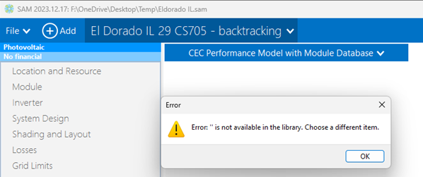 - At the top of the page, switch from CEC Performance model with User Entered Specifications to CEC Perfomance Model with Module Database.