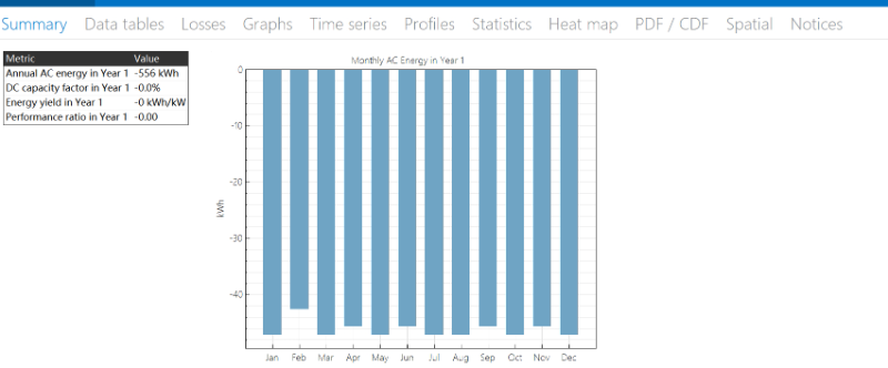 Negative total monthly output usually indicates a problem with the inputs. You might try looking at the Losses tab on the Results page to see what is causing the problem.