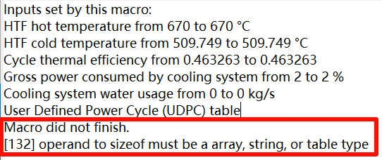 Recently, I want to run a simulation about MSPT with SCO2 power cycle. I try to use the sCO2 cycle integration macro to define the power cycle. After running the macro, the message box shows "Macro did not finish, [132] operand to sizeof must be a array, string, or table type". See the picture below. Does problem affect the simulation and how to solve this problem.