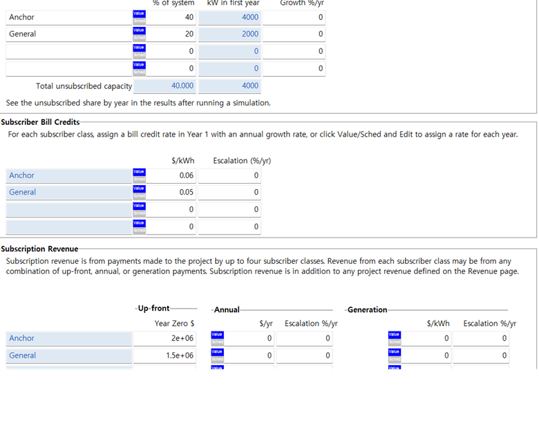 The subscriber bill credits are separate: These credits might be paid to the subscribers by the electric utility, or some partner other than the system owner. The subscirber class NPV is the present value of the bill credits for that class.