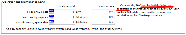 I'm working on a Solar Water Heating System for a client in US. During financial analysis, I found that the annual escalation charges associated with (1) annual fixed cost $/yr, (2) Fixed cost by capacity $/kW-yr and (3) Variable cost by generation $/MWh are shown 0%.