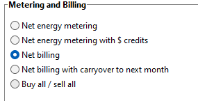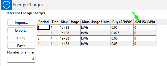 For SAM's Residential and Commercial financial models, the sell rate is not available in the Energy Charges table for the net energy metering option. It is available for all of the other options: