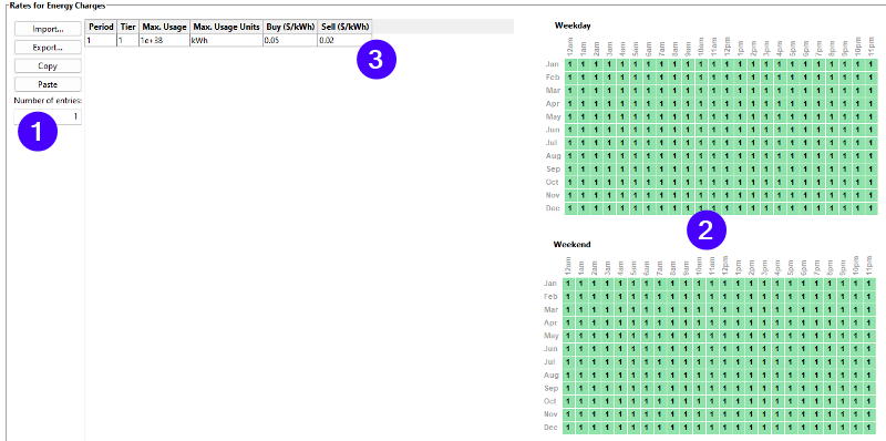 If you are modeling a flat rate with no time-of-use rates or tiers, set the number of entries to 1 so that the table has only Period 1 and Tier 1, and then set the Period in the weekday and weekend schedules to 1 for all months and hours by selecting the entire schedule matrix and typing a "1". You can then set the flat buy and sell rates in the Energy Charges table: