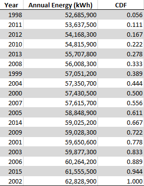 2. Sort the resulting annual energy values in increasing value, and assign each value a probability equal to 1 divided by the number of values. For example, the table below shows results for 18 years, so each value is assigned a probability of 1 / 18 = 0.056.