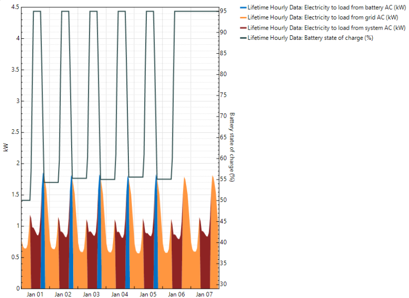 By default, the graph uses the "Stacked area on left axis" option to show power flows to the load from the system, battery, and grid. This is helpful for seeing how the load is being met:
