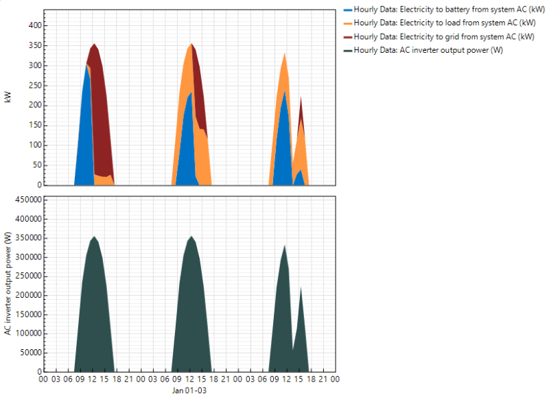 For the PVWatts model with storage, AC inverter output power represents the output of the PV array. A stacked area plot of Electricity to battery from system AC, Electricity to grid from system AC, and shows where the PV array power is going: