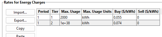 Also, there is a mistake in the energy charge table: You have specified Period 1 and Period 2 in the table, but only Period 1 is defined in the Weekday and Weekend schedules. For a tiered rate with no time-of-use periods, you should specify Period 1 for both rows, and Tier 1 and Tier 2 for the Period 1 tiers like this: