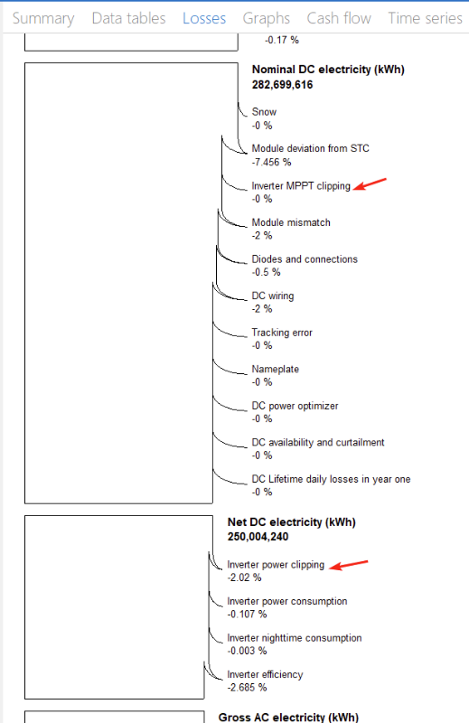 The diagram on the Losses tab of the Results page shows minimal losses as a percentage of array and inverter electric output due to inverter voltage clipping and power limiting: