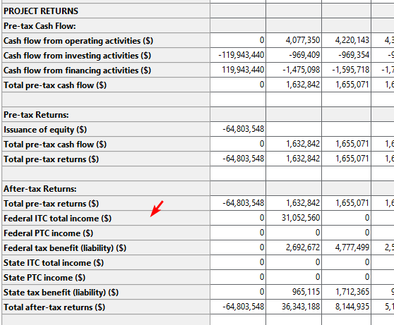 The tax credit income, including for the Federal ITC is reported in the "Project Returns" section of the cash flow under "After-tax returns":