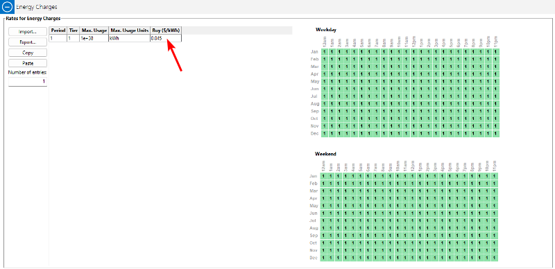 You can also define a more complex rate structure with fixed monthly charges, time-of-use (TOU) rates, and/or demand charges by entering the appropriate data under "Fixed Charge", "Energy Charges", and "Demand Charges".