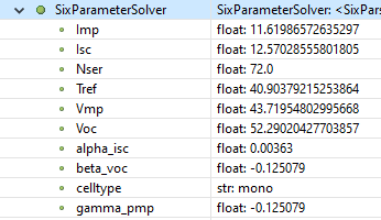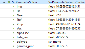 From section 9 in ( www.nrel.gov/docs/fy15osti/64102.pdf ) you can see that using CEC Module Model as the PV panel selection it uses the single diode model and solves it using Newtons method. It also states that the parameters are extracted using 6parsolve which is the same module i'm using for all the DC operating points which pvsam1 spits out. I'm also extracting the cell temperature and the irradiance because they account for some of the inputs to the sixparametersolver. It doesn't make sense to me that it will fail because pvsam1 is providing me the following inputs that I use for the sixparametersolver input: