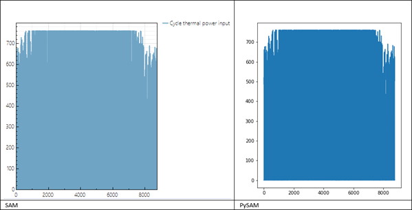 I do not understand how the cycle thermal input can be maxed out for both while the gross electricity produced dips below its maximum in PySAM. Would you have any insights on these differences?